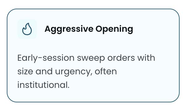 ● Bearish aggressive open: Heavy put buying at ask, downside sweeps in indices → hedging or conviction short bets.